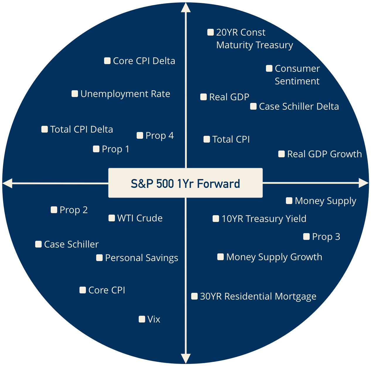 This model is a visual representation of the variables and mathematics behind the model. Each variable is assigned a weighting based on its predictive accuracy and the summation of those weightings and variables providers an estimate for the S&P 500 1 year in the future.